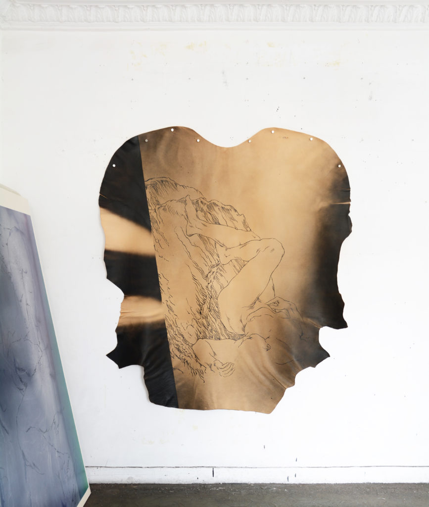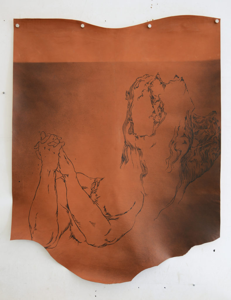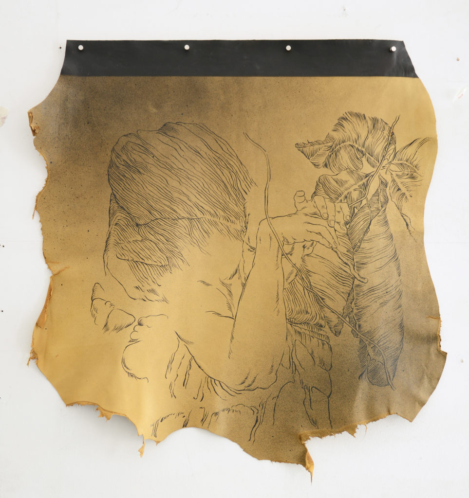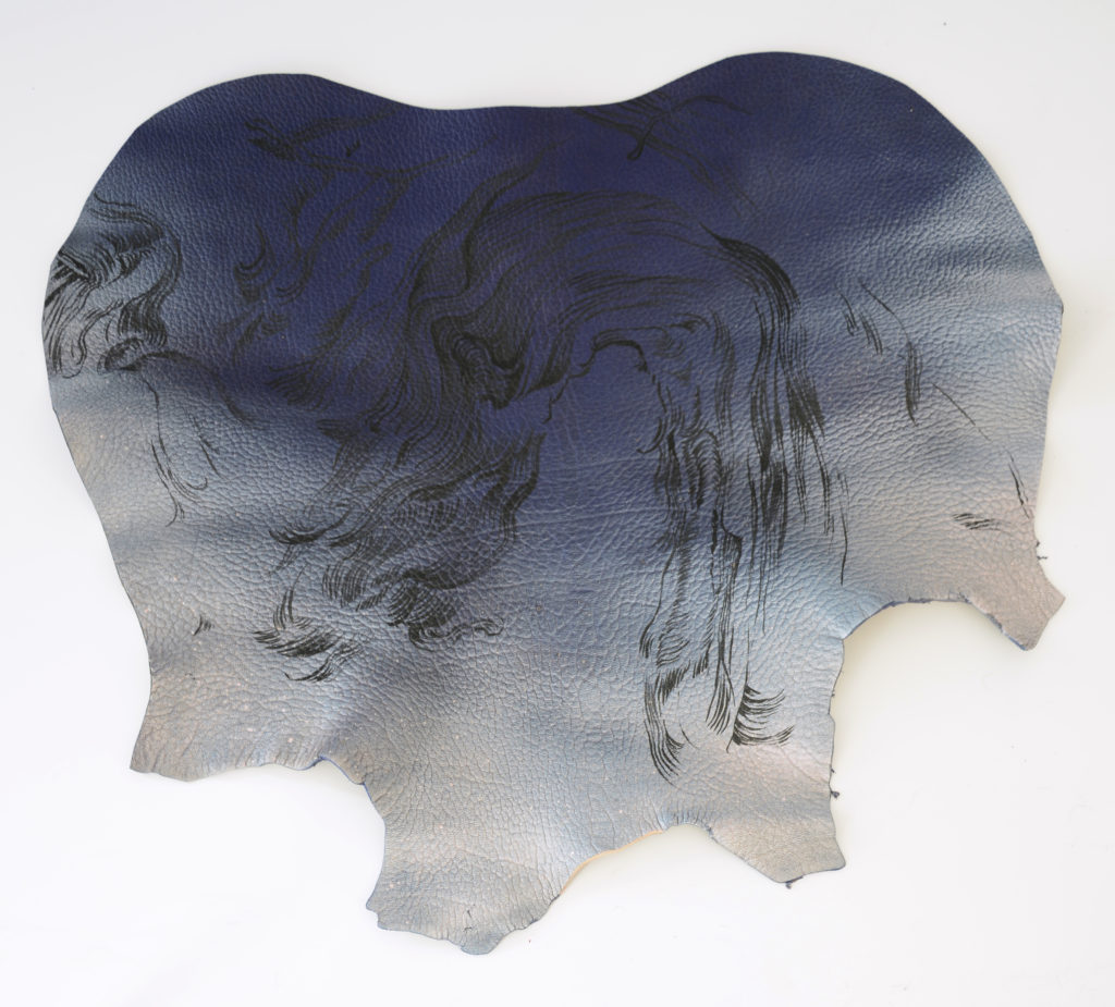 Au cours des derniers mois, j’ai compris à quel point la question du support allait permettre à mon travail de se renouveler. La toile libre m’avait apporté liberté et souplesse. Elle avait aussi permis le retour du tactile, de la sensualité des matières, qui étaient bien présentes jusqu’alors dans mes peintures sur PVC, mais comme mises à distance. C’est alors que je suis aller fouiller au fond de l’atelier et que j’ai ressorti quelques pièces de cuir qui y trainaient depuis des années…