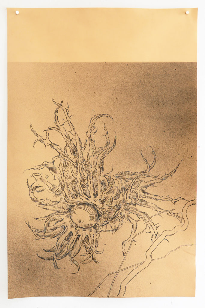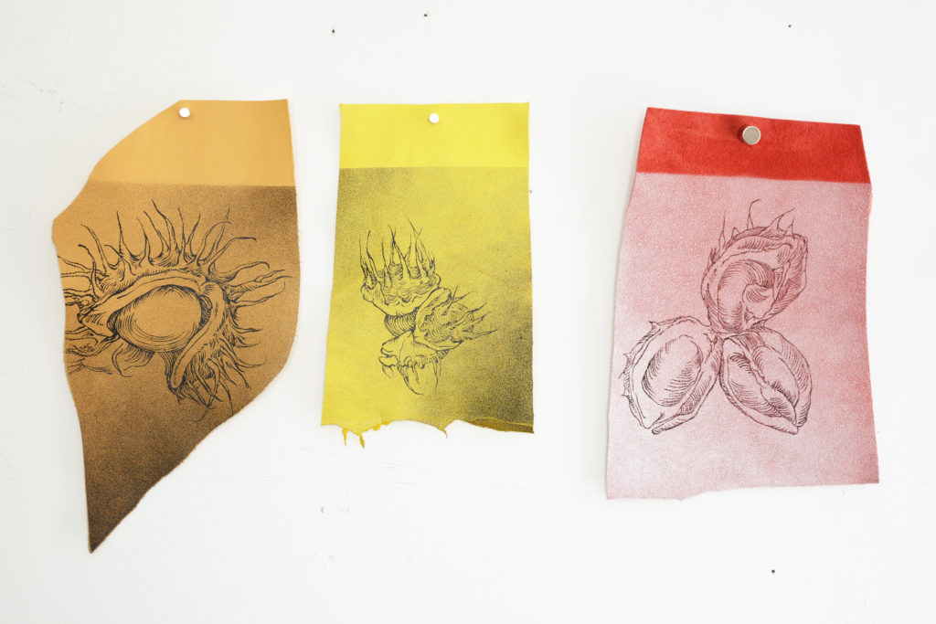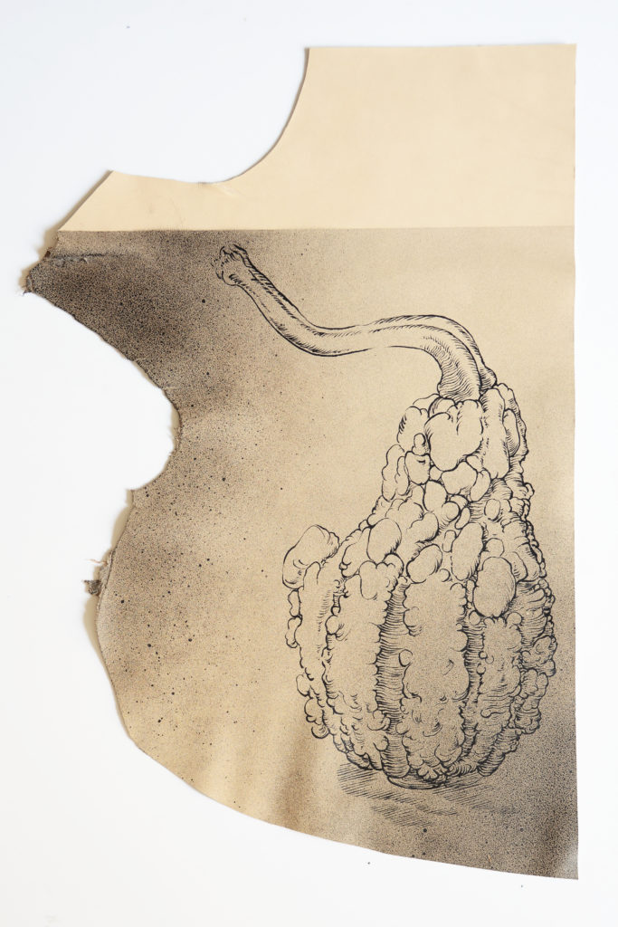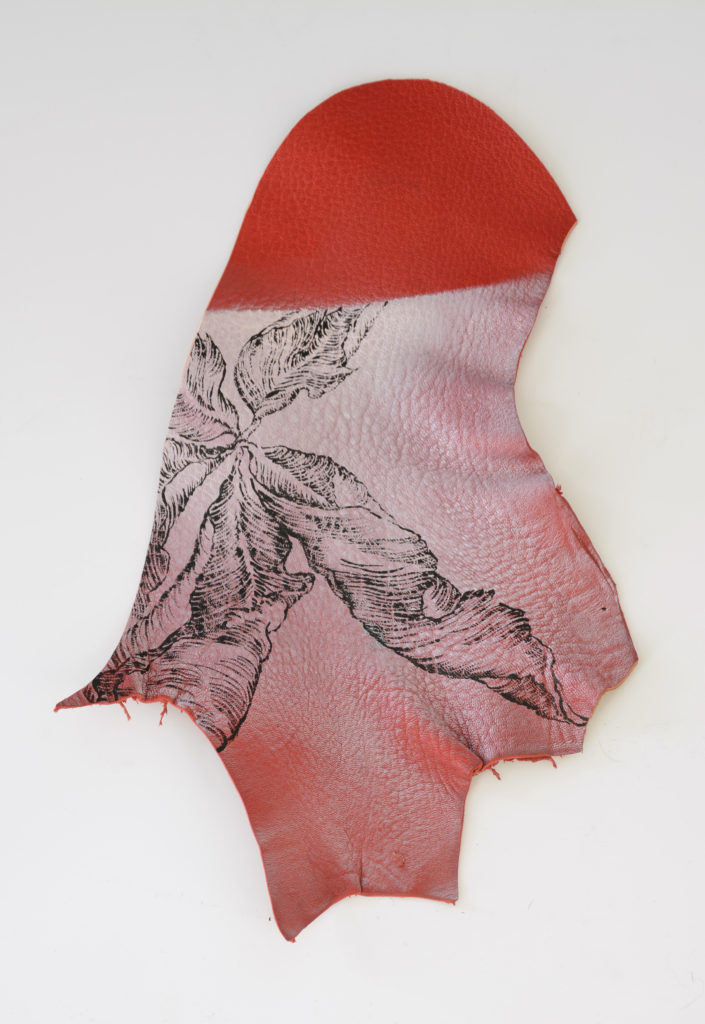 Au cours des derniers mois, j’ai compris à quel point la question du support allait permettre à mon travail de se renouveler. La toile libre m’avait apporté liberté et souplesse. Elle avait aussi permis le retour du tactile, de la sensualité des matières, qui étaient bien présentes jusqu’alors dans mes peintures sur PVC, mais comme mises à distance. C’est alors que je suis aller fouiller au fond de l’atelier et que j’ai ressorti quelques pièces de cuir qui y trainaient depuis des années…