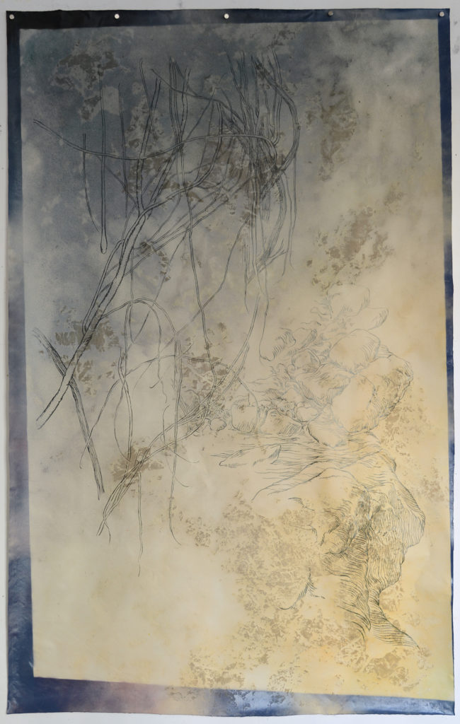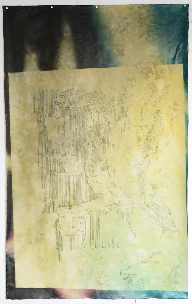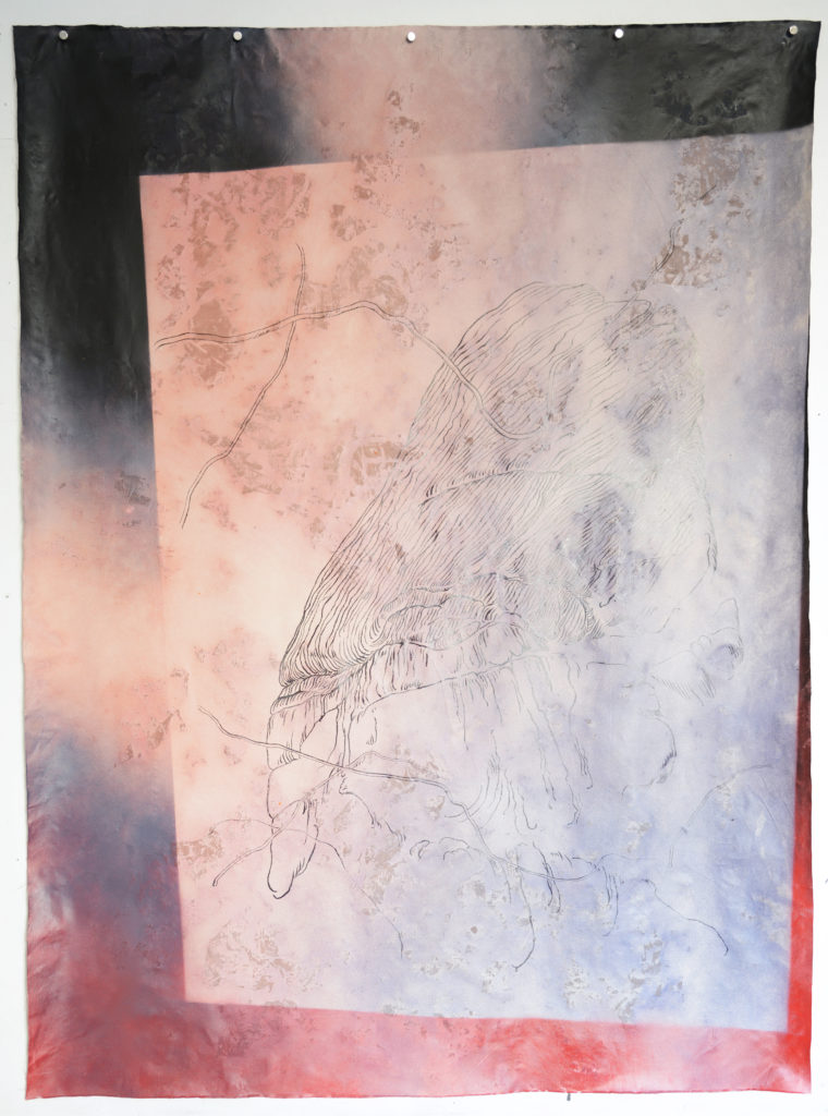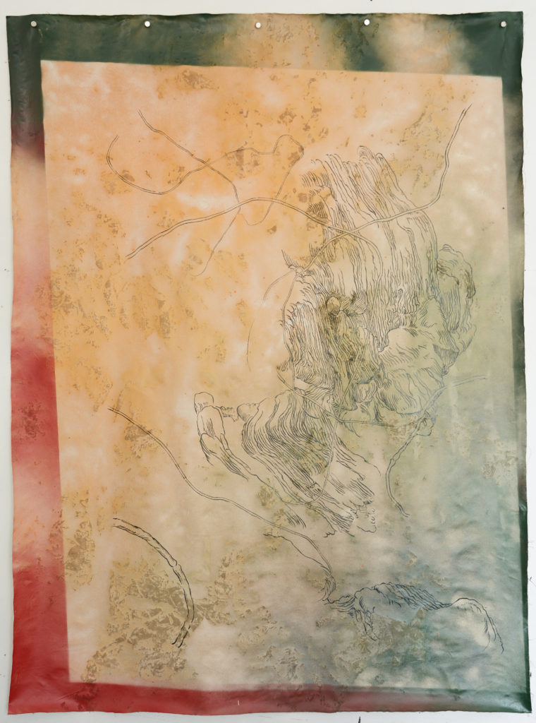 Dans la foulée de ma résidence à Céreste en Luberon j’ai poursuivi mon travail sur toile libre, initié début 2025. Tout avait débuté autour du corps dans l’espace. La toile libre m’était apparue comme un support de liberté, dans tous les sens du terme. Facile à rouler, à stocker, à transporter. La question du paysage s’était ensuite imposée à Céreste. De retour dans l’atelier, mes dessins envahissaient la toile, émergeant dans des espaces picturaux oscillant entre tapisserie, fresque, peinture…